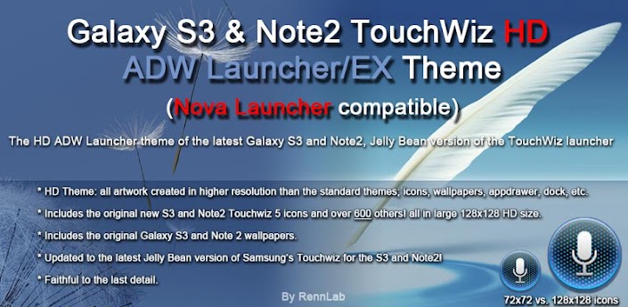 The difference is in the details. Updated to reflect the lastest Touchwiz Launcher version of Jelly Bean for the Galaxy S3 & Note2, with this theme's unique combination of a themed skin, HD wallpapers and 600+ HD icons.